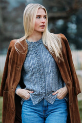 A fresh take on the classic women's oxford--this ruffle front shirt adds a festive flair to any ensemble.