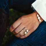 The pearls on this elegant ring sit in open scallop shells attached by a band featuring a natural rope motif, the fibers of which are carefully preserved through the polishing process, resulting in a truly unique ring.