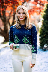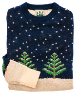 An ode to the enchanting Christmas season and the magic of the first snowfall of the year. Warmly made, this sweater is itself a beautiful canvas of a starry winter night sky with freshly fallen snow covering evergreen trees.