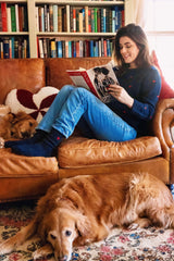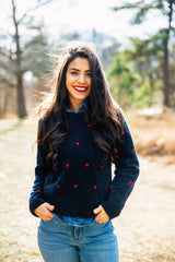 This beautifully crafted Donegal catches the light with colorful flecks and features the warmth and whimsy of delicate red embroidered hearts. A perfect casual addition to your wardrobe, we love to pair with our new matching Donegal socks for a cozy head-to-toe feeling this season.