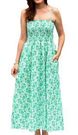 The perfect blend of summertime charm and sophistication. The light green and white floral pattern brings a fresh, garden-inspired look with delicate shoulder straps and a sleeveless design adding to its comfortable appeal on sunny days. Paired with a straw hat and sandals, this dress is lovely for a leisurely stroll in a blooming garden or a casual outdoor gathering.