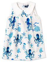 Embrace the whimsical spirit of summer in our Octopus Garden Shift, adorned with vibrant hues of blue reminiscent of an underwater paradise. Let the playful charm of this dress transport your little one to a world of sunshine and sea breezes!