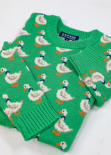 The Duckling Parade Kids Sweater in Green is a pre-order item and ships on or around 02/05.
