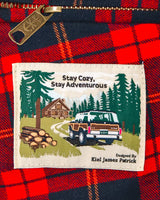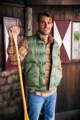 The Cozy Cabin Puffer Vest is made for spontaneous crisp outdoor adventures. Lightweight yet protective, its 100% polyester shell and fill block out the elements without weighing you down, while our cozy plaid flannel lining wraps you in warmth and comfort. Finished with thoughtful details like custom KJP brass buttons and our iconic cabin emblem on the chest, this vest captures the spirit of the outdoors with every wear.