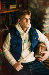The Cozy Cabin Puffer Vest is made for spontaneous crisp outdoor adventures. Lightweight yet protective, its 100% polyester shell and fill block out the elements without weighing you down, while our cozy plaid flannel lining wraps you in warmth and comfort. Finished with thoughtful details like custom KJP brass buttons and our iconic cabin emblem on the chest, this vest captures the spirit of the outdoors with every wear.