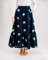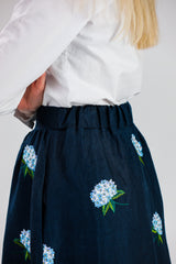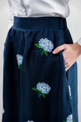 Hydrangea Embroidered Linen Skirt in Navy