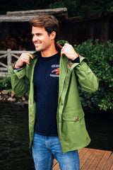 The Old Salt Raincoat in Green- Men's is a pre-order item in size S and ships on or around 10/30.
