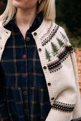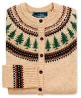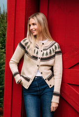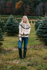 Step into the quiet beauty of the season with the Winter Pines Fair Isle Cardigan. Inspired by the evergreens that line snowy New England roads, it’s knit from soft, winter-weight yarn and finished with a traditional Fair Isle yoke in forest greens and deep pine hues. A cozy layer for tree trimming, winter walks, and fireside warmth.