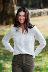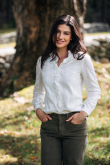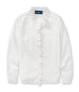 A fresh take on the classic women's oxford--this ruffle front shirt adds a festive flair to any ensemble.