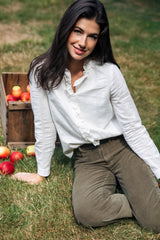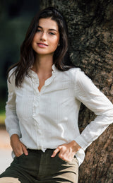 Orders for The Harrington Ruffle Shirt placed on or after 10/7 in sizes XS, S, M, XL, XXL and ship on or around 11/10.
