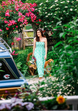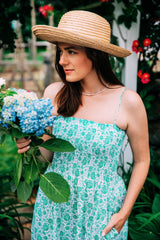 The perfect blend of summertime charm and sophistication. The light green and white floral pattern brings a fresh, garden-inspired look with delicate shoulder straps and a sleeveless design adding to its comfortable appeal on sunny days. Paired with a straw hat and sandals, this dress is lovely for a leisurely stroll in a blooming garden or a casual outdoor gathering.