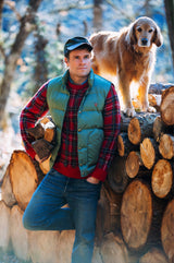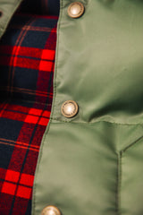 The Cozy Cabin Puffer Vest is made for spontaneous crisp outdoor adventures. Lightweight yet protective, its 100% polyester shell and fill block out the elements without weighing you down, while our cozy plaid flannel lining wraps you in warmth and comfort. Finished with thoughtful details like custom KJP brass buttons and our iconic cabin emblem on the chest, this vest captures the spirit of the outdoors with every wear.