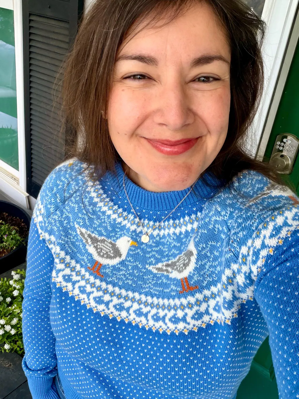 A bright and beautiful nod to coastal life, this Fair Isle features gulls wrapped around the yoke with fish below, set against a blue canvas inspired by the water. Soft, comfortable, and easy to wear, it’s a timeless layer for cool mornings and relaxed afternoons alike.