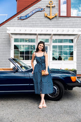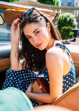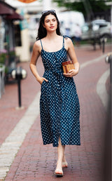 The Grace Polka Dot Maxi Dress is a timeless symbol of old-school summer glamour. Crafted from a luxurious silk-cotton blend, this dress features adjustable shoulder straps, a matching sash belt, and a tiered skirt that flows gracefully. The button placket and lined interior add convenience and comfort to this stunning piece that is truly ready for any summer soirée.